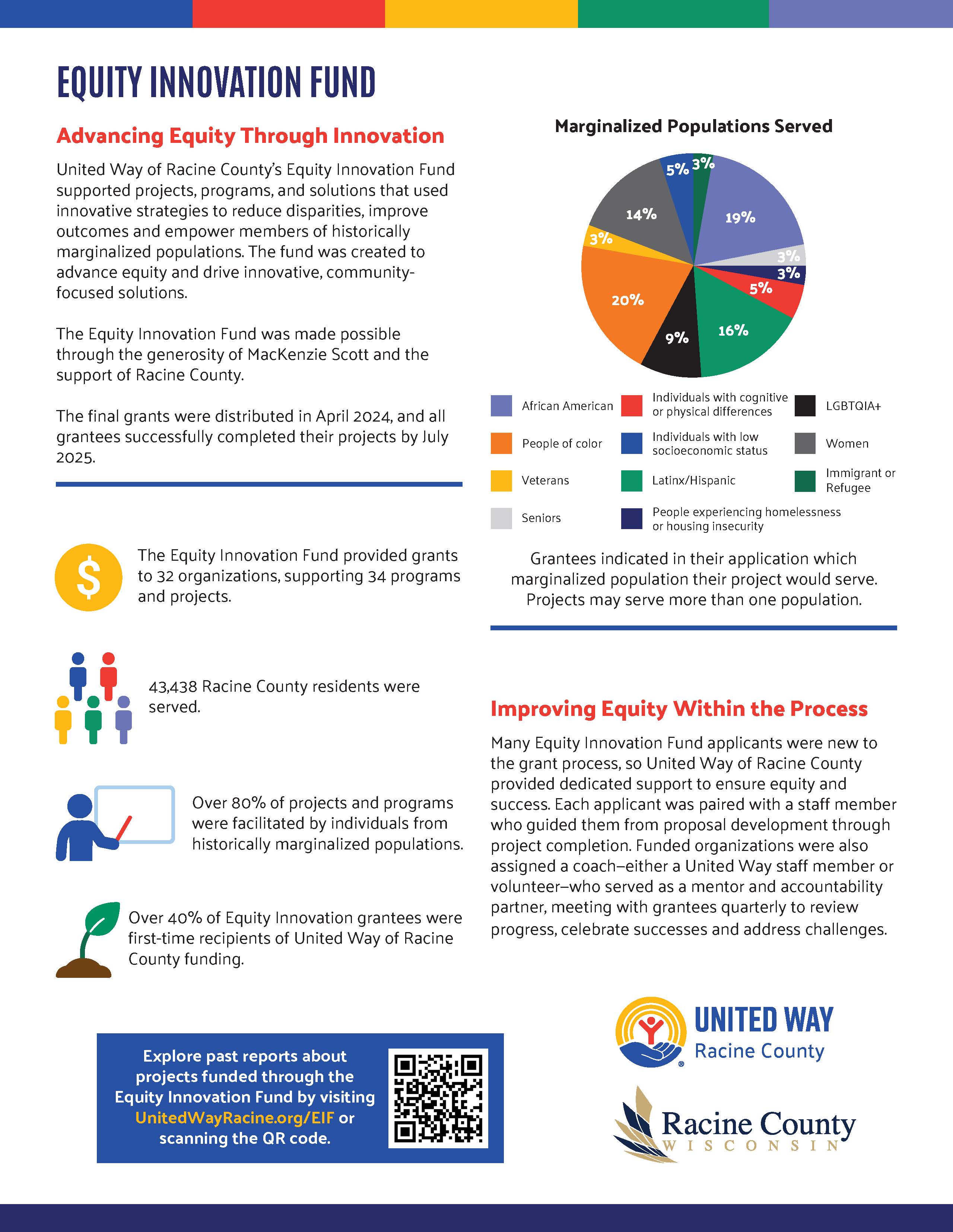 United Way of Racine County's Equity Innovation Fund supported projects, programs and solutions that used innovative strategies to reduce disparities, improve outcomes and empower members of historically marginalized populations. The fund was made possible through the generosity of novelist and philanthropist MacKenzie Scott, and through support from Racine County.