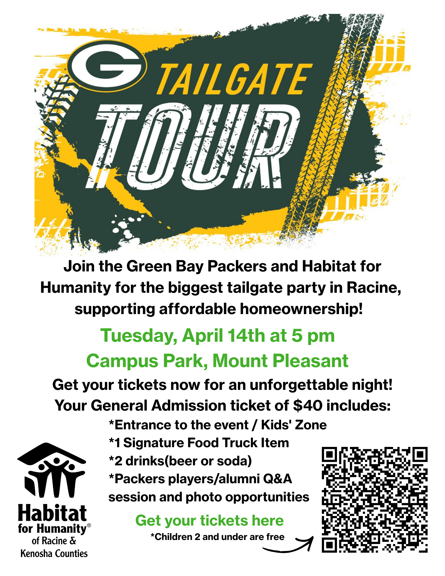 Join us for the Green Bay Packers Tailgate Tour as it makes a stop right here in our community at Campus Park in Mount Pleasant on Tuesday, April 14 at 5:00 pm. This special event is a fundraiser supporting Habitat for Humanity of Racine and Kenosha Counties and our work to build affordable housing in our community!